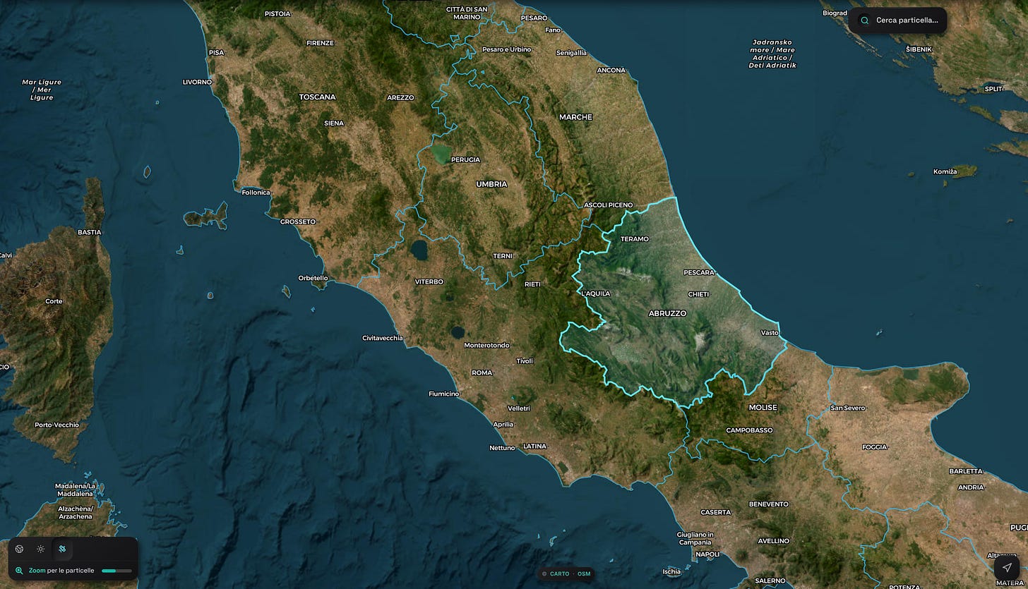 Mappa satellite. Un click e si passa dalla mappa scura alla vista aerea con le immagini ESRI. I colori delle particelle si leggono comunque bene. L'abbiamo aggiunta perché ci è stato fatto notare che con la Positron DarkMatter di Carto poi era difficile orientarsi. A tutti i geometri che usano la nostra app: prego.