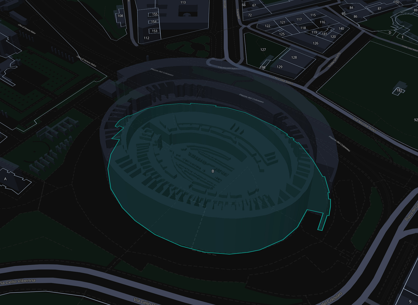 Edifici 3D. Se tieni premuto Ctrl, le impronte degli edifici si sollevano dalla mappa. Sono semitrasparenti, si attivano quando zoomi abbastanza. Non cambia la vita, ma aiuta un botto a orientarsi tra le particelle in centro città.