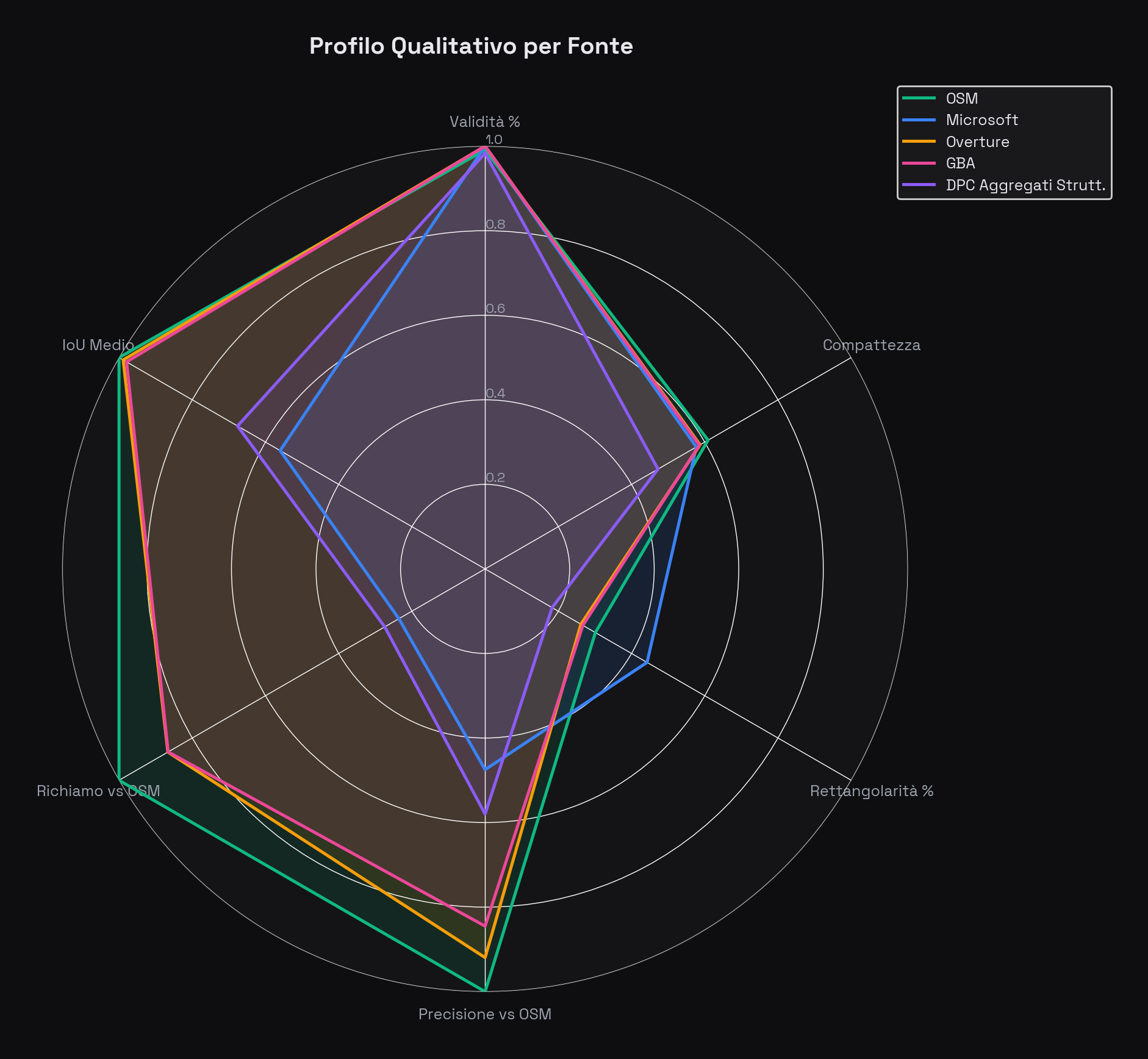In breve: Overture raggiunge un F1 di 0,88, GBA segue a 0,84, Microsoft crolla a 0,26. Però la completezza, l’IoU, la distanza dei centroidi e la distanza di Hausdorff raccontano storie diverse a seconda che si guardi il centro di Roma o la Toscana rurale. Vale la pena leggersi l’analisi per intero.