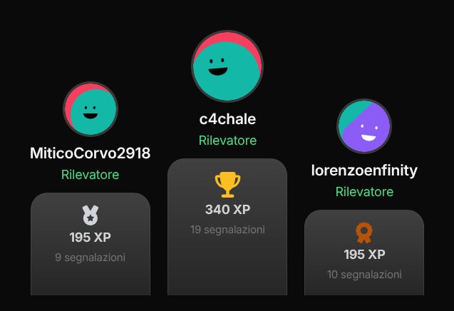 Gamification. Abbiamo assegnato a tutti gli utenti username e avatar casuali, con una classifica basata su XP. C'è già chi domina il podio (complimenti c4chale) e chi ha aperto un ticket perché a parità di XP il posto più alto dovrebbe andare a chi ha più segnalazioni. Aveva ragione, corretto.